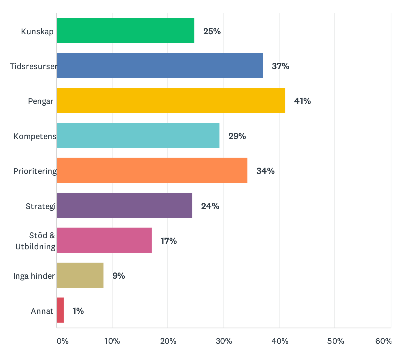När företagarna fick frågan om de största hindren kring digitalisering, uppgav de brist på tid, brist på pengar samt utmaningar att prioritera bland initiativ som rejäla bromsklossar: “Jämfört med storbolag upplever mindre företag betydligt fler hinder kring digitalisering. Tröskeln att komma igång kan verka hög för många företagare, som har fullt upp med att hålla igång verksamheten,” säger Michael Hansen.